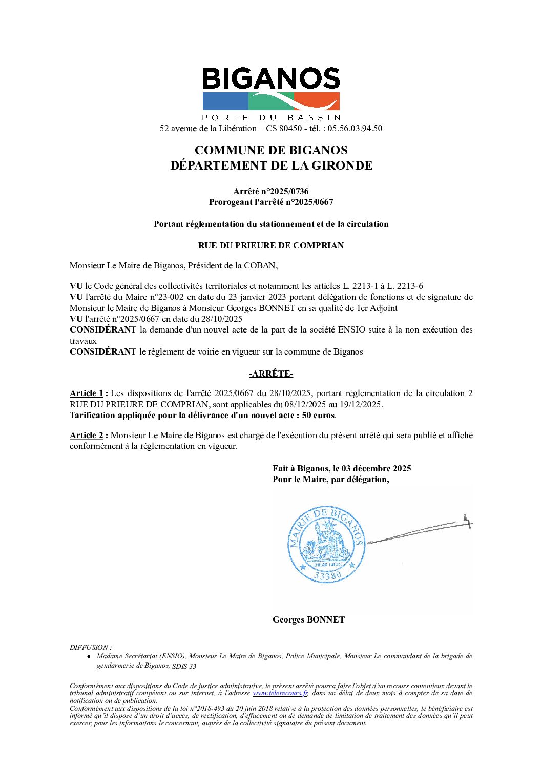 ARRETE – 2025-0736 – PROROGEANT L’ARRETE 2025-0667- RUE PRIEURE DE COMPRIAN
