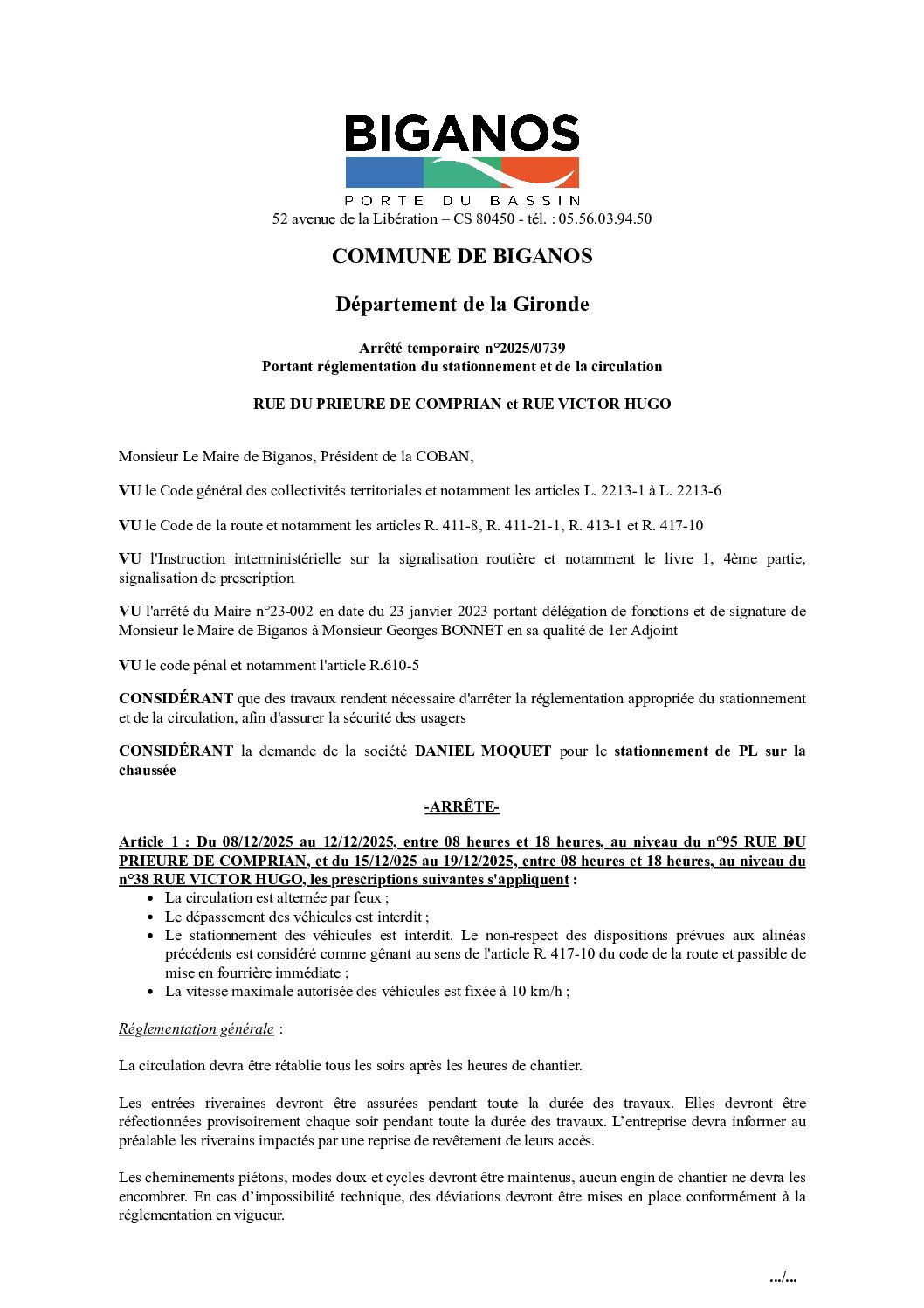 ARRETE 2025-0739 – RUE DU PRIEURE DE COMPRIAN ET RUE VICTOR HUGO