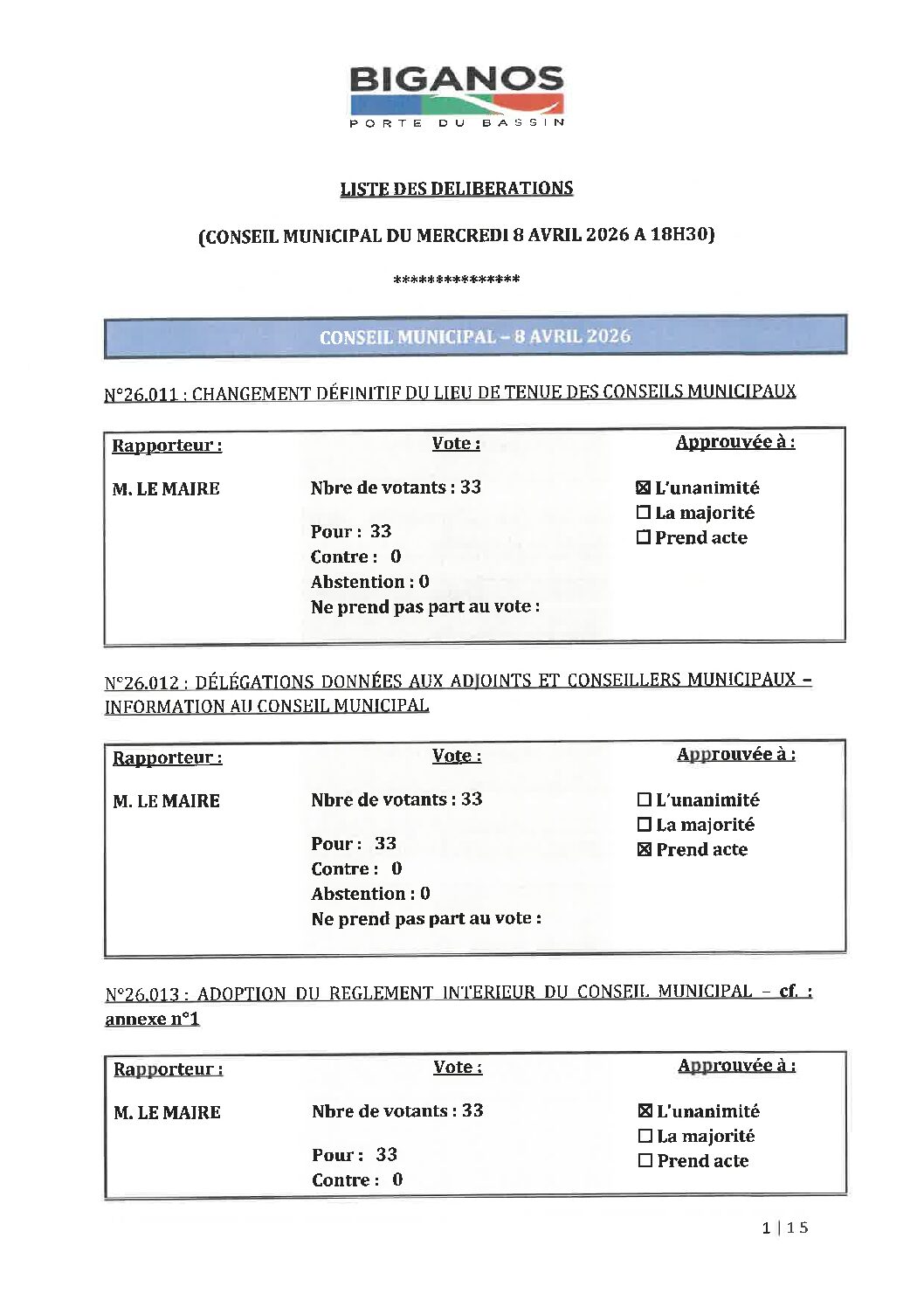 LISTE DES DELIBERATIONS CM DU 08.04.2026