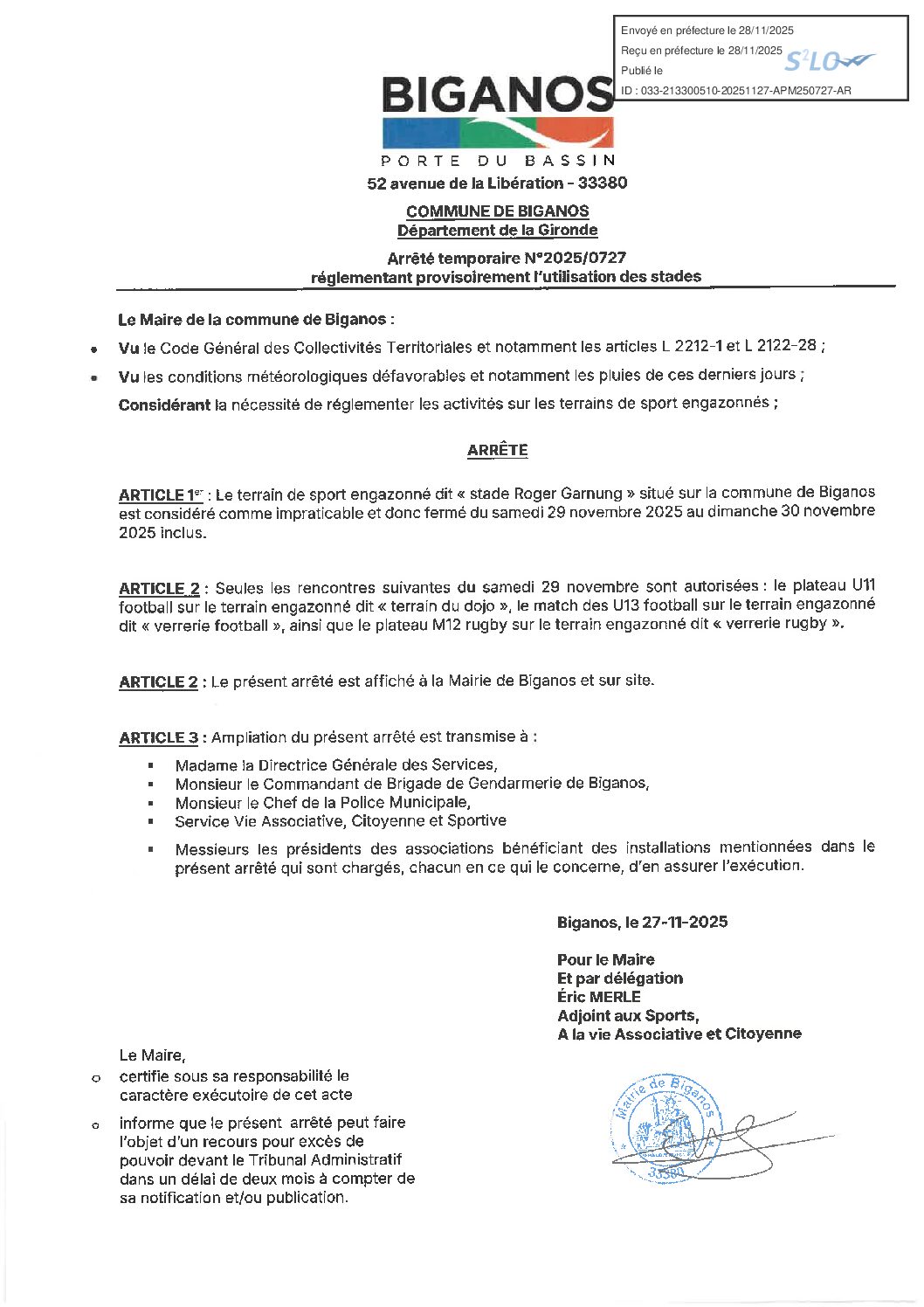 ARRETE 2025-0727 REGLEMENTANT PROVISOIREMENT L’UTILISATION DES STADES