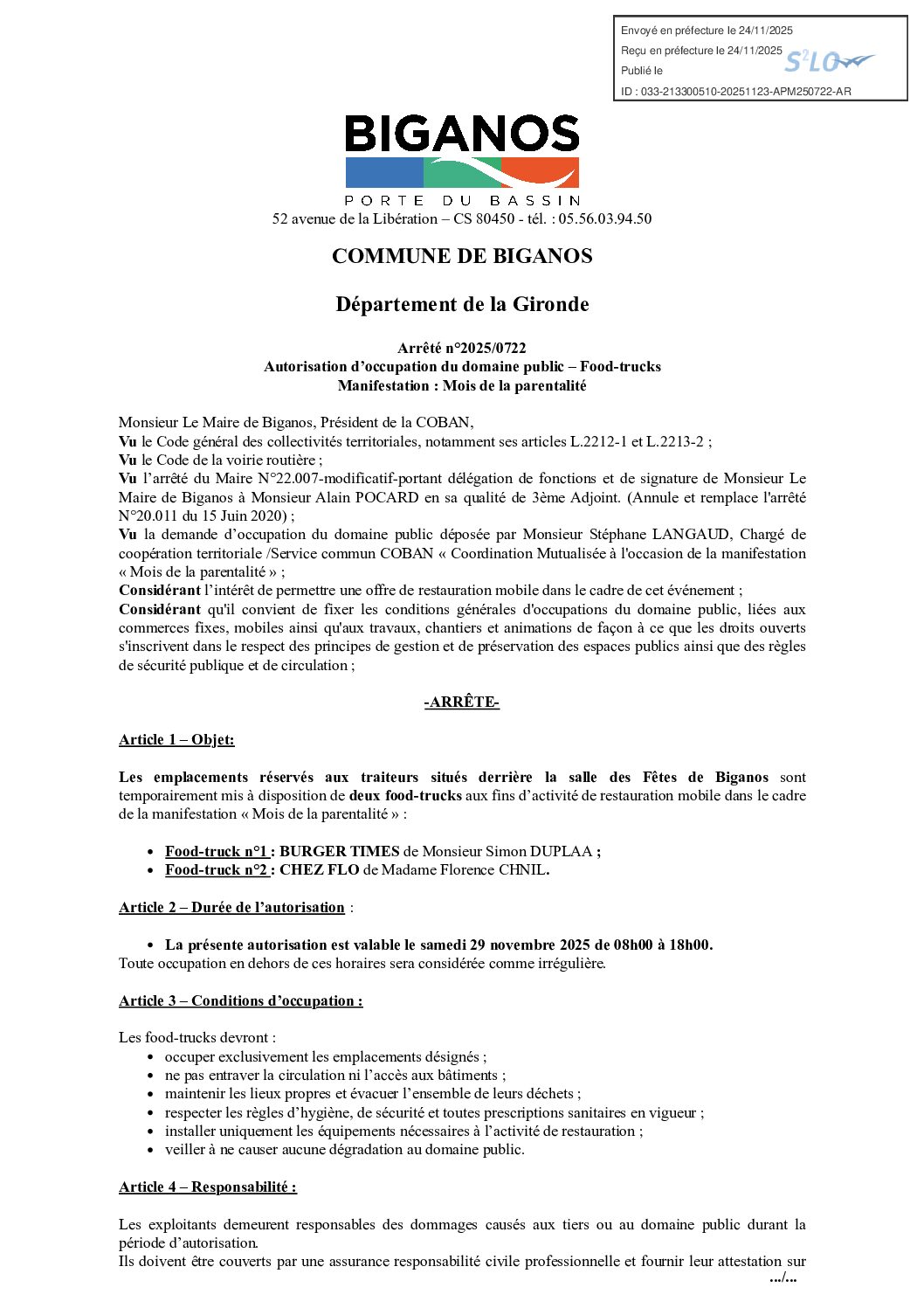 ARRETE N°2025-0722 AUTORISATION D’OCCUPATION DU DOMAINE PUBLIC…