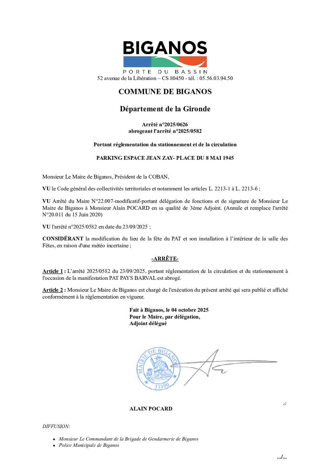 ARRETE N°2025-0626 ABROGEANT L'ARRETE N°2025-0582 PORTANT REGLEMENTATION…