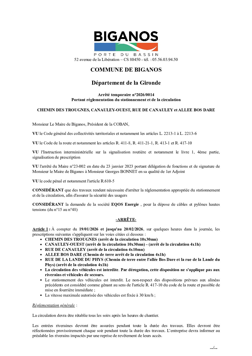 ARRETE 2026-0014- CHEMIN DES TROUGNES, CANAULEY-OUEST, RUE…